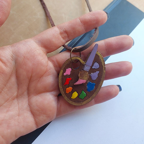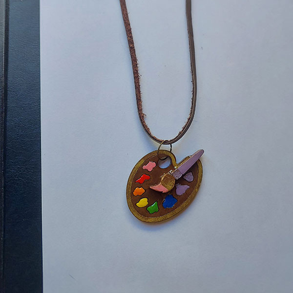 گردنبند چوبی که دارای پلاکی زیبا طرح پالت رنگ و قلم مو می باشد و زیبایی دو چندانی به گردنبند بخشیده است. گردنبند با گره در پشت گردن بسته می شود و می توانید هر اندازه که دوست دارید آن را هنگام کره زدن تنظیم کنید. محصول توسط کلبه طلایی تهیه و عکاسی شده و این گردنبند بهترین گزینه برای دادن هدیه به هنرمندان نقاش است. رنگ پالت قهوه ای رنگ می باشد و رنگ های شاد و جذابی روی آن مشاهده می شود.