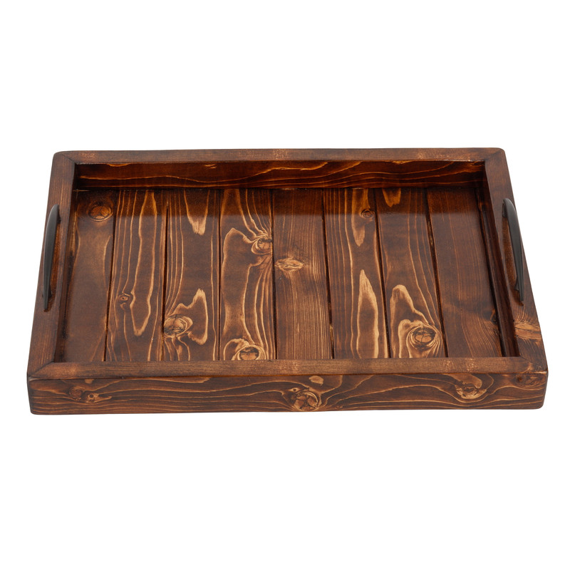 سینی چوبی تولید شده از چوب نراد روسی درجه یک همراه با دسته فلزی با کیفیت با رنگ قهوه ای و روکش نیم پلی استر جهت آبگریز شدن کالا و براقیت و ظاهر زیبا مناسب سرو و پذیرایی و دکوری