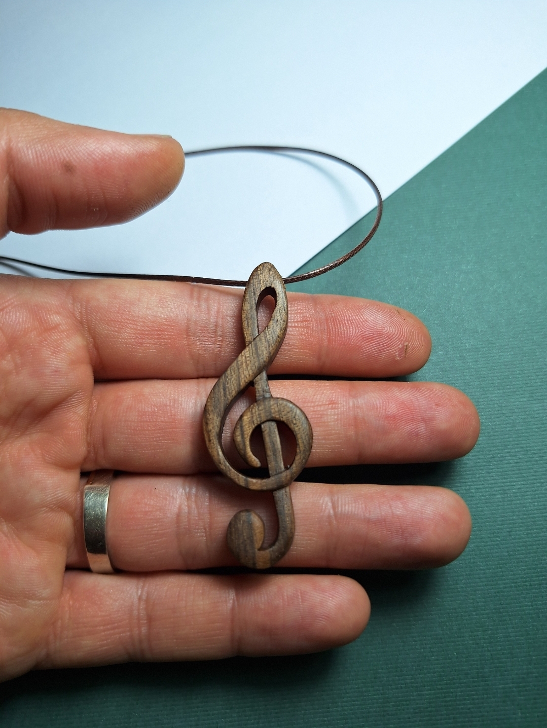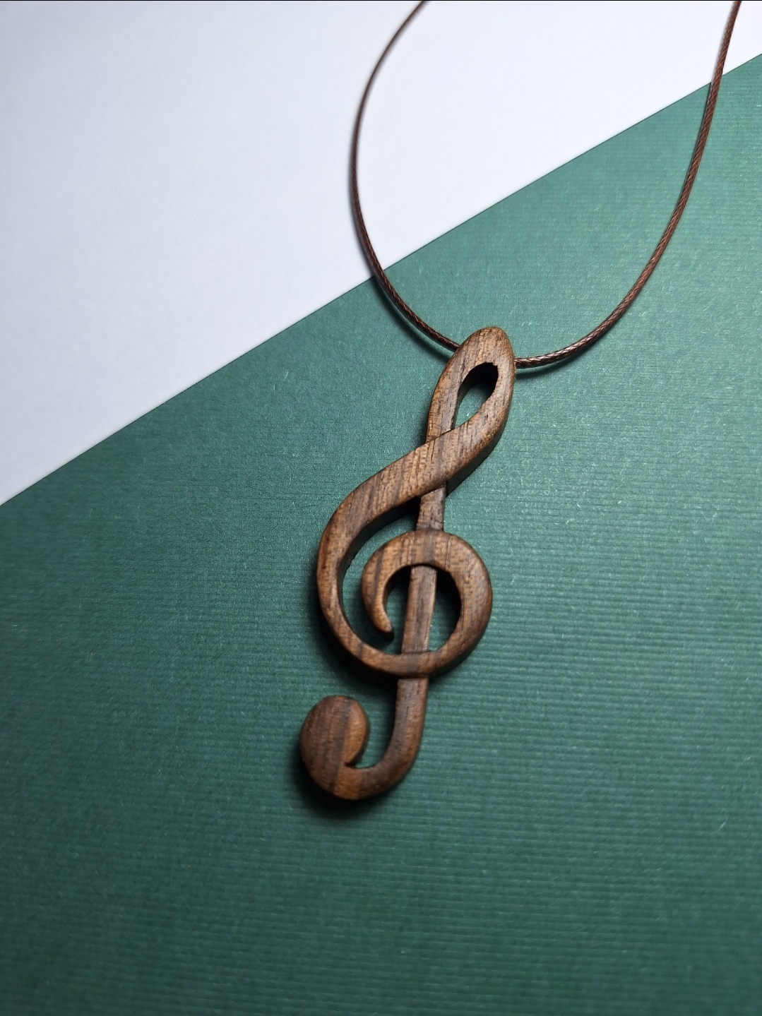 این آویز چوبی با الهام از نماد جهانی موسیقی، یعنی کلید سل، از چوب گردوی طبیعی تراش خورده است. فرم منحنی و روان این طرح، هویت هنری و موسیقایی آن را برجسته میکند و پرداخت صیقلی آن باعث میشود رگههای طبیعی چوب در نهایت زیبایی دیده شوند.