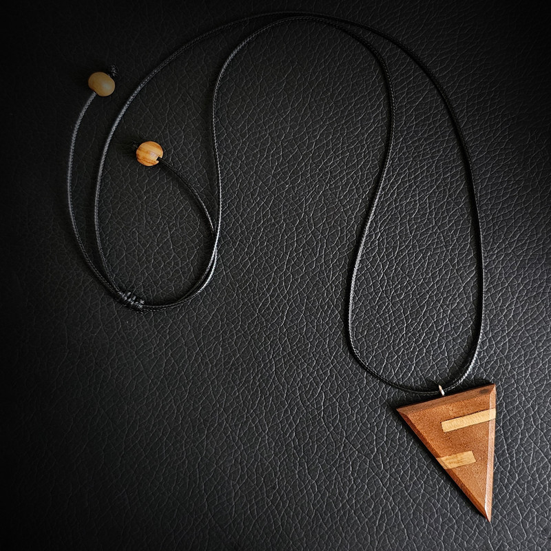 گردنبند چوبی زیبا با طرح مثلث که کاملا دست ساز ساخته شده است با روکش محافظ روغن ایتالیایی و بند طرح چرم قابل تنظیم اندازه که در انتهای بند به صورت بافت تعبیه شده است که کاربر میتواند به راحتی سایز گردنبند را کوتاه یا بلند کند .