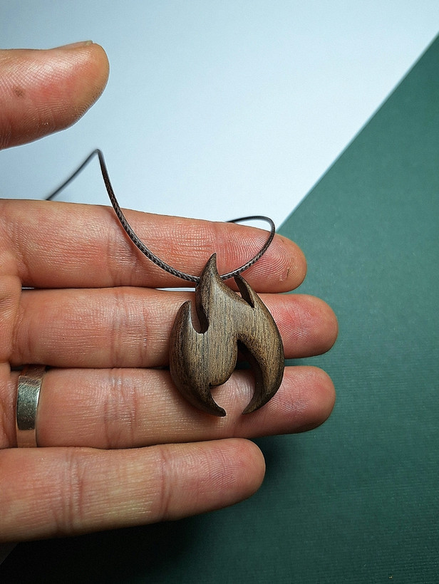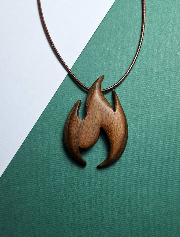 این آویز دستساز با فرم روان و یکپارچهی آتش، نمادی از انرژی، قدرت، تحول و گرماست. قطعه از چوب گردوی طبیعی ساخته شده و رگههای طبیعی چوب، جلوهای زنده و گرم به آن میدهد.