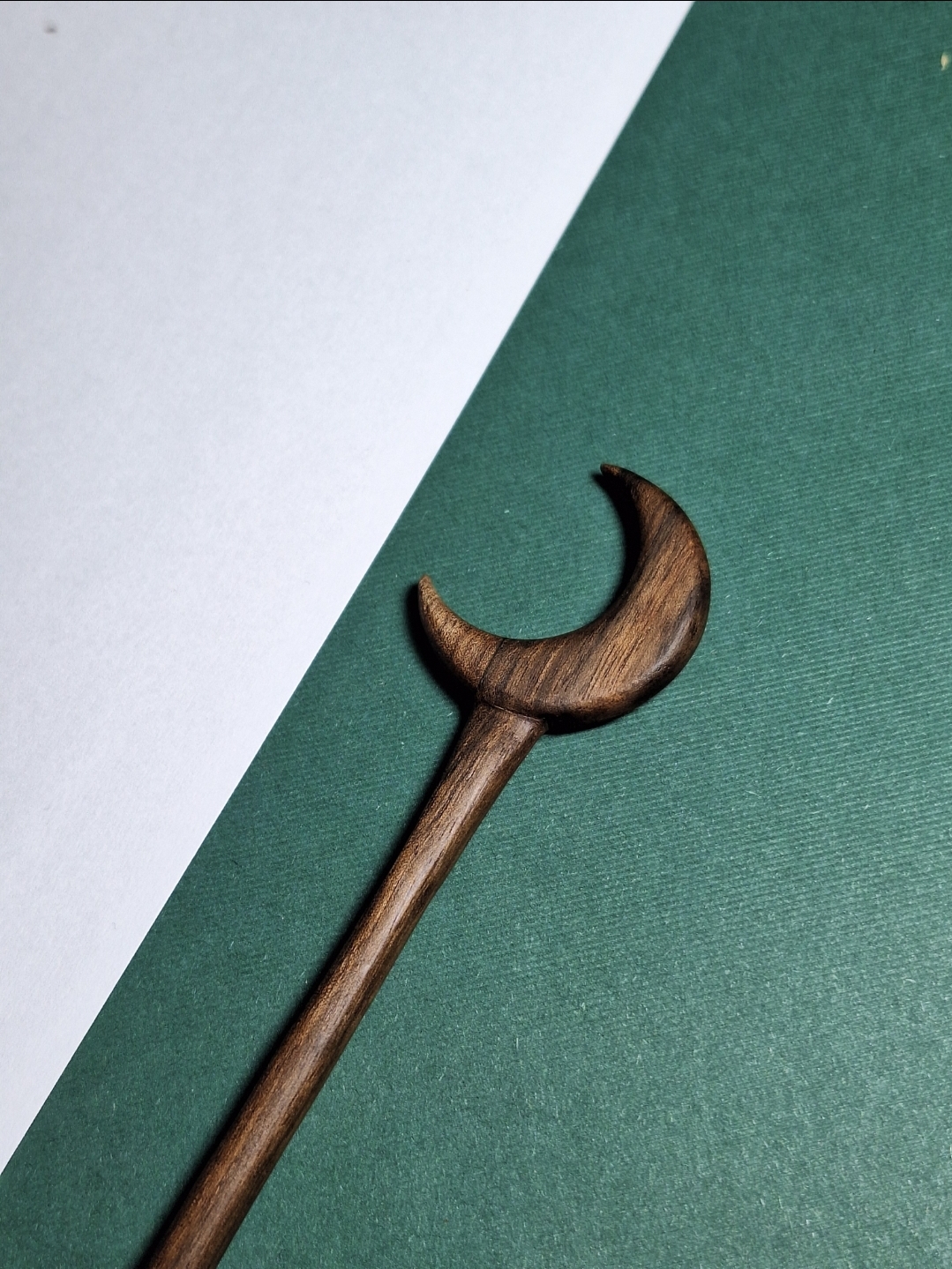 یک اکسسوری دستساز و الهامگرفته از زیبایی ماه در شبهای آرام. این کانزاشی از چوب گردوی طبیعی تراشیده شده و قسمت بالایی آن با نقش هلال ماه، ظاهری شاعرانه، مینیمال و کاملاً خاص به خود گرفته است.
