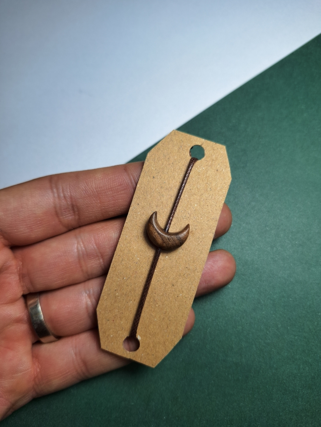 این دستبند دستساز با الهام از هلال ماه، از چوب گردوی طبیعی تراشیده شده و فرم نرم و موجدار آن، زیبایی شبانه و آرامش طبیعت را به همراه دارد. رگههای واقعی چوب، هر قطعه را به یک نسخهی کاملاً یونیک تبدیل میکنند و رنگ گرم گردو در کنار بند قهوهای، ترکیبی هماهنگ و مینیمال ایجاد کرده است.