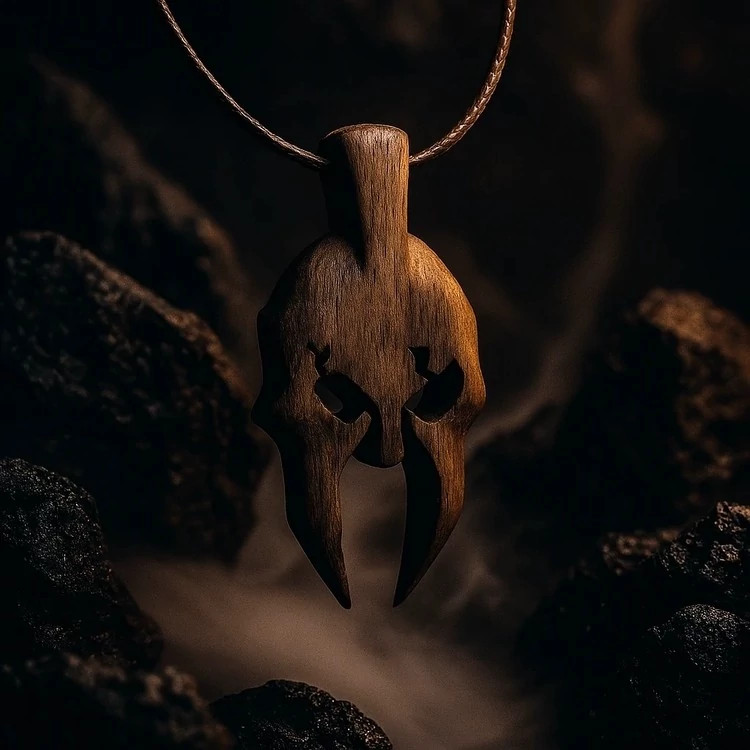 این آویز دستساز از چوب گردوی طبیعی با الهام از کلاهخود اسطورهای اسپارتانها تراش خورده است؛ نمادی از قدرت، جسارت و ایستادگی. فرم زاویهدار چشمها و برشهای دقیق روی چوب، هویت قدرتمند و مردانهای به این طرح میبخشد.