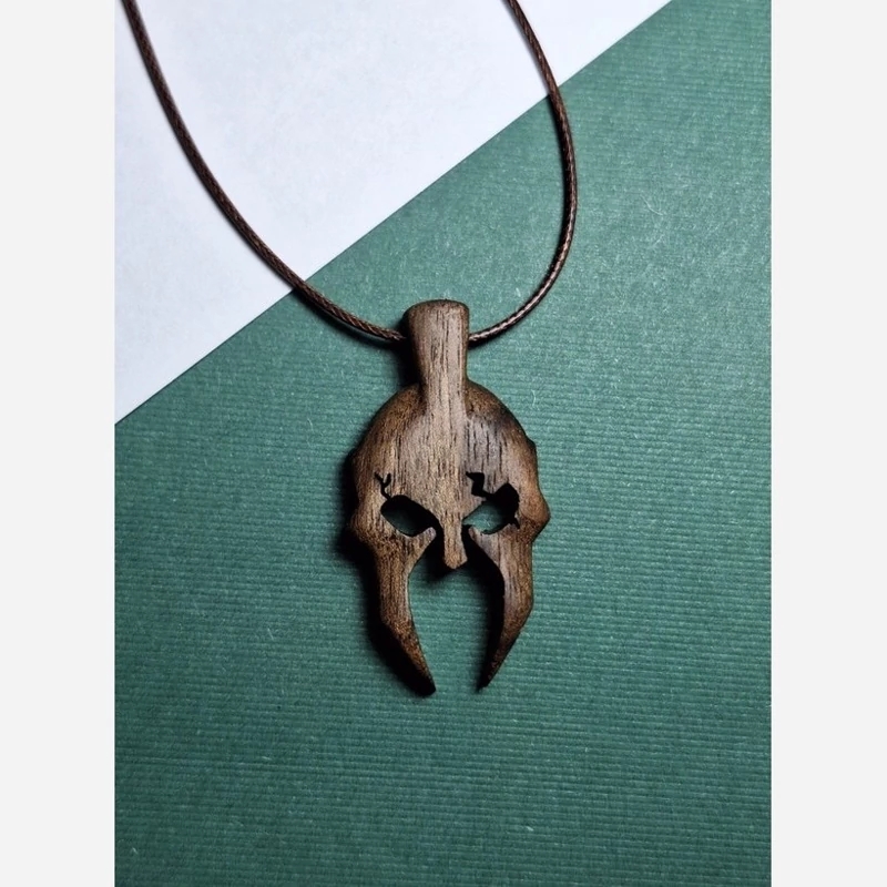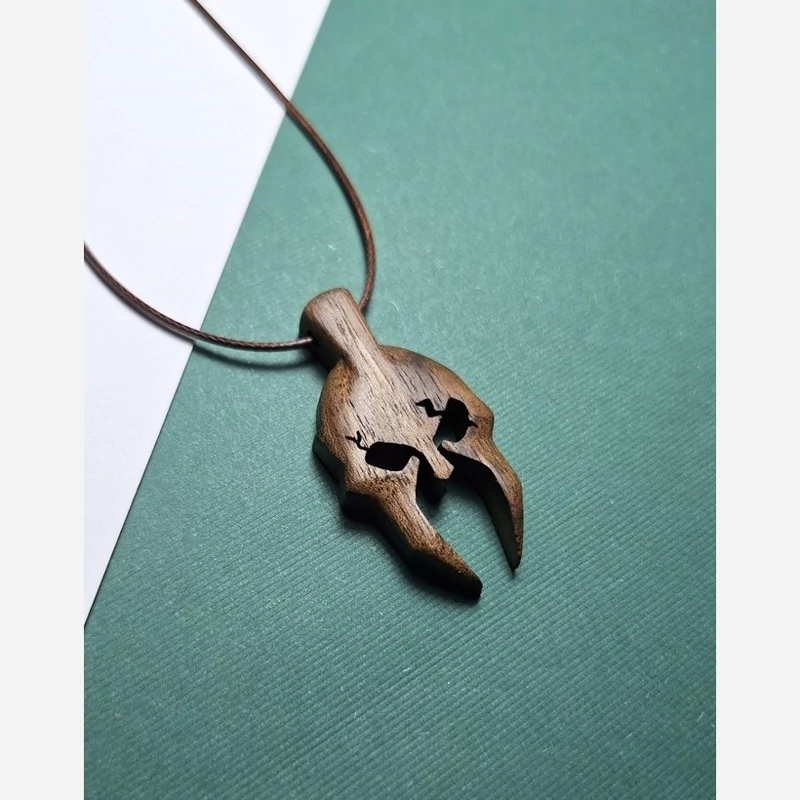 این آویز دستساز از چوب گردوی طبیعی با الهام از کلاهخود اسطورهای اسپارتانها تراش خورده است؛ نمادی از قدرت، جسارت و ایستادگی. فرم زاویهدار چشمها و برشهای دقیق روی چوب، هویت قدرتمند و مردانهای به این طرح میبخشد.