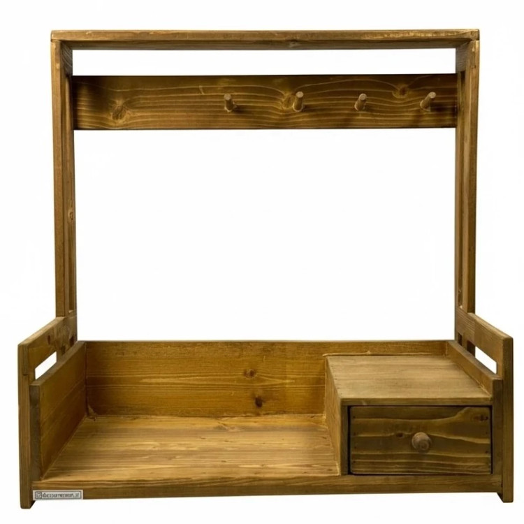 شلف یا استند نگهدارنده دستگاه اسپرسو ساز خانگی که دارای یک کشو جهت نظم دادن به وسایل جانبی و محتویات قهوه ساز می باشد . این شلف رومیزی دارای 4 عدد جای ماگ و شات قهوه می باشد که علاوه بر این که طراحی آن را زیبا تر کرده،همچنین باعث کاربردی بودن این شلف نیز شده است.بدنه ی این شلف کاملا از چوب طبیعی ساخته شده که استحکام مطلوبی دارد.